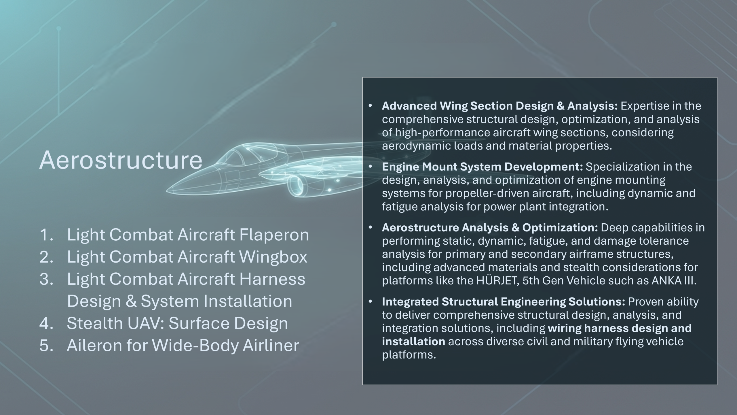 Our structural engineering team emphasizes on design-for-manufacturability to enable innovative solutions to address challenges in producing safe & reliable commercial and military aircrafts.